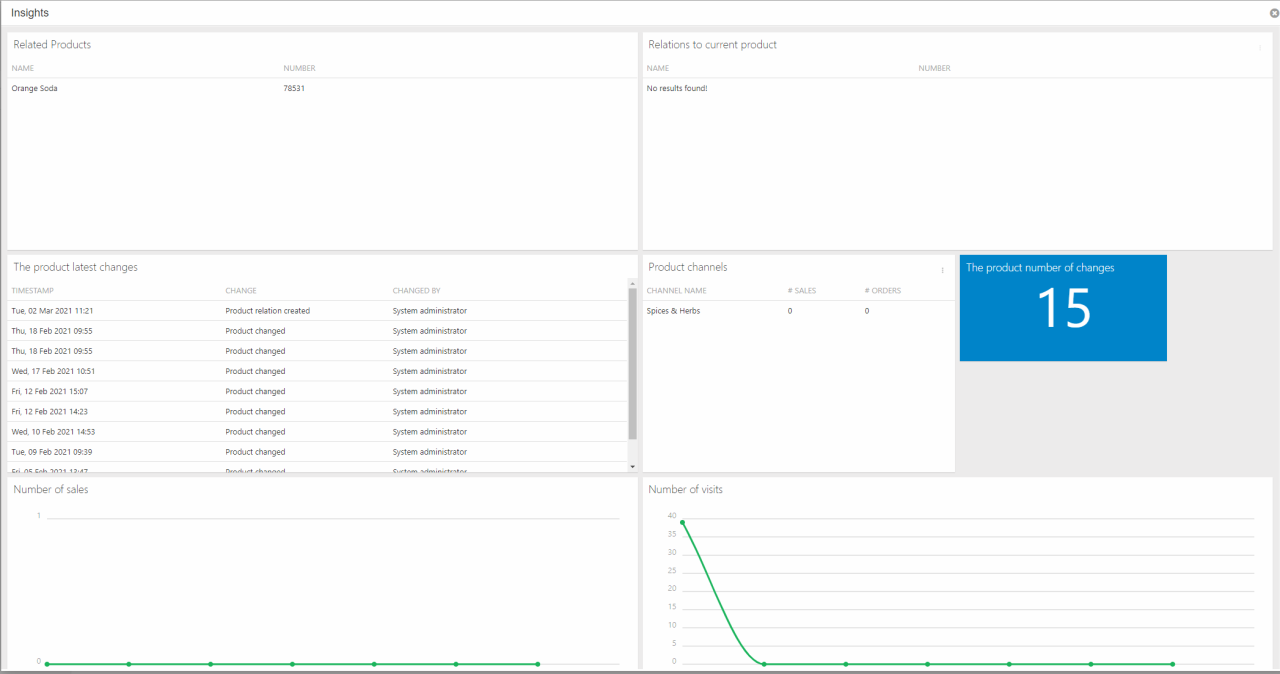 As of Dynamicweb 9.10, all PIM products feature an Insights dashboard which provides you with in-depth information about the product, e.g.: