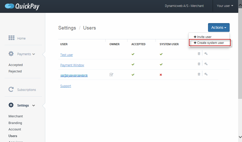 You can either use the default user – called ‘Payment Window’ – or create a custom user.