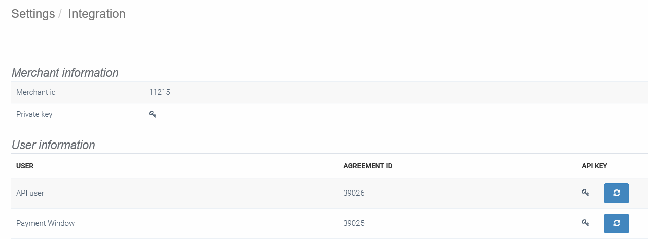 The Merchant ID and Agreement ID are readily available – click the key-icons to access the Private Key for your account, and the API key for any of your users.