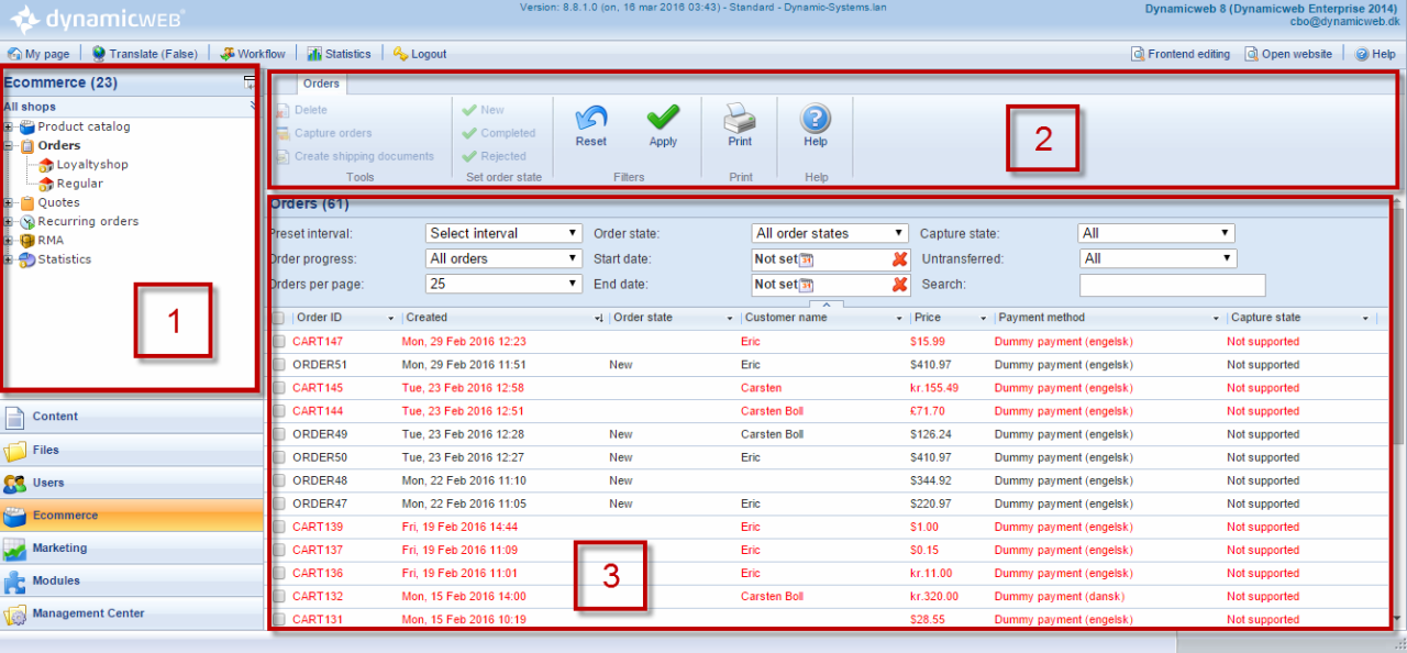 • The toolbar (2) – which gives you access to the various functions, actions and settings in Dynamicweb Ecommerce. The toolbar changes depending on where in the system you are.
