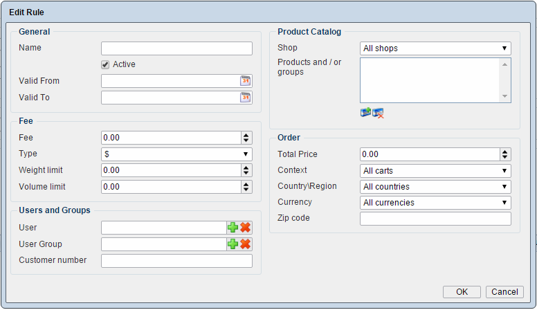 To create a fee rule, click the Click here to add a new row text to open the rule-window (Figure 5.2).