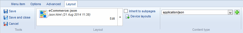 - Open the Page Properties for the page and select your JSON layout file (json.html) from the dropdown list in the Layout section of the layout tab. Under Content type, select application/json (Figure 3.2).