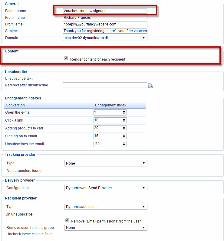 Since these types of emails need to have their content rendered for each recipient – because they have unique shopping cart contents – we suggest you create and configure separate top folder for abandoned cart emails.
