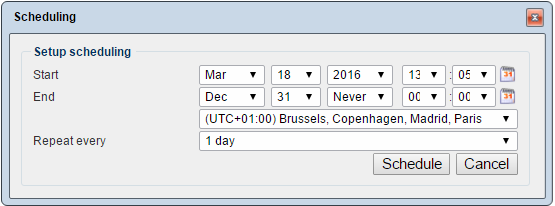 - Select a start date and time and an end date and time. If you want to let the campaign run for an unlimited time, select never as the end year.
