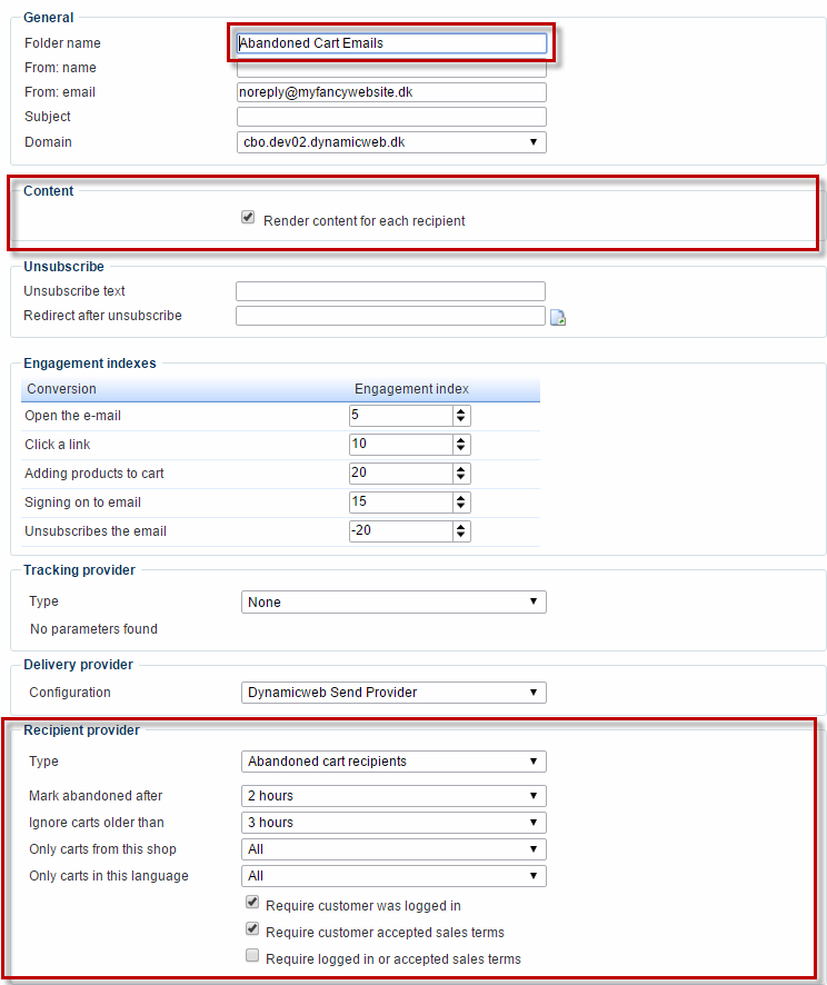 Since these types of emails need to have their content rendered for each recipient – because they have unique shopping cart contents – we suggest you create and configure separate top folder for abandoned cart emails.