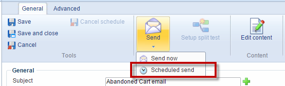 Once the abandoned cart email-page is to your liking, go to Marketing > Email Marketing and create a new email in your Abandoned Cart Emails top folder.