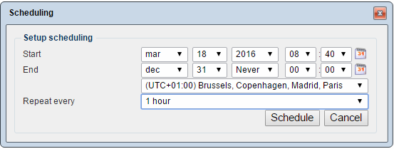 - Select a start date and time and an end date and time. If you want to let the campaign run for an unlimited time, select never as the end year.