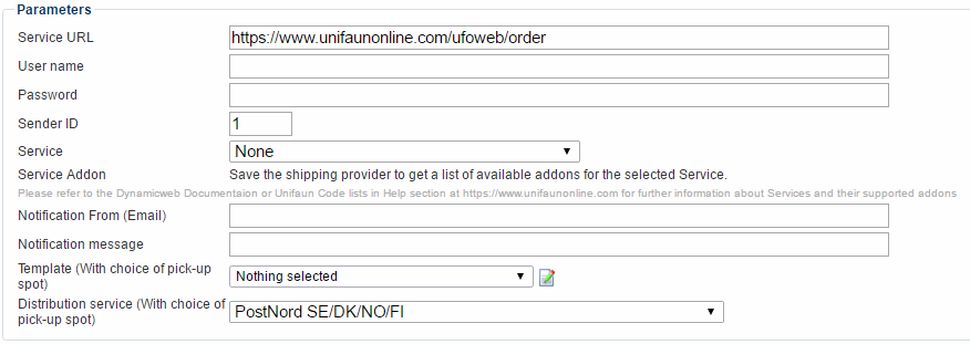 - Provide a Sender ID (quick ID). If you have more than one sender profile associated with your Unifaun Online-account, enter the one you want to use with this method. Read more about Senders and Receivers (PDF) in this Unifaun document.