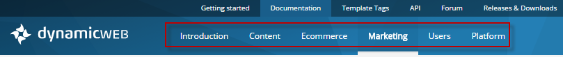 Use the top-level navigation (Figure 3.1) to find the documentation for the main areas of Dynamicweb; Content, Ecommerce, Marketing, Users, Platform and Integration.