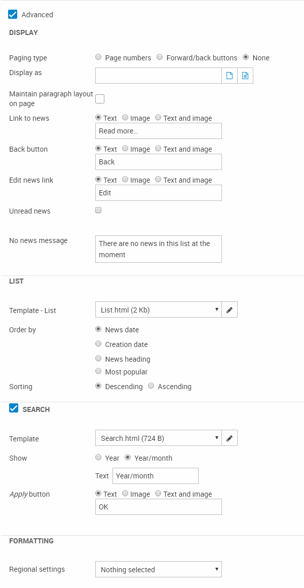 The formatting settings let you set a region for the news list – this will determine e.g. the date-format used.