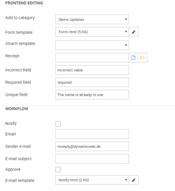 The workflow settings allow you to notify someone (an editor) every time an article is created from frontend. The approve checkbox lets the editor approve or discard a submission – a discarded submission is deleted.
