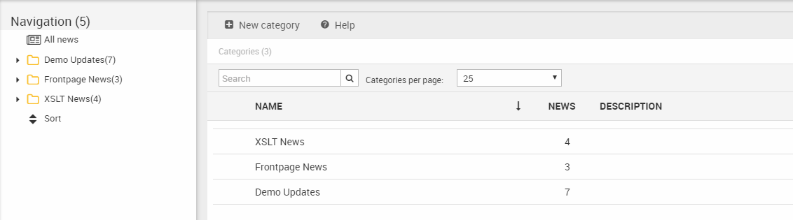 - The content panel on the right, where news articles under the selected category are listed – and can be created or edited