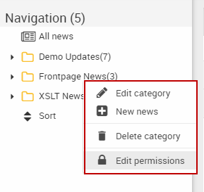 Right-click any category to open the context menu (Figure 2.2), from which you can edit or delete a category, create a news article, or edit the category permissions settings.