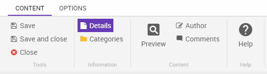 When creating or editing an article you have access to three tabs in the ribbon bar; content, options and marketing. From these, you may access advanced functionality related to news articles.