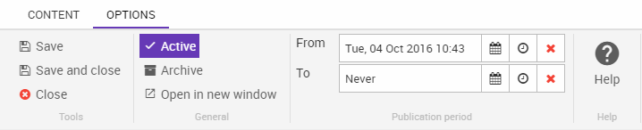 - Set a publication period during which the article is displayed. Once the period runs out the article will be marked as inactive on the news items list, but will not be moved to the archive automatically