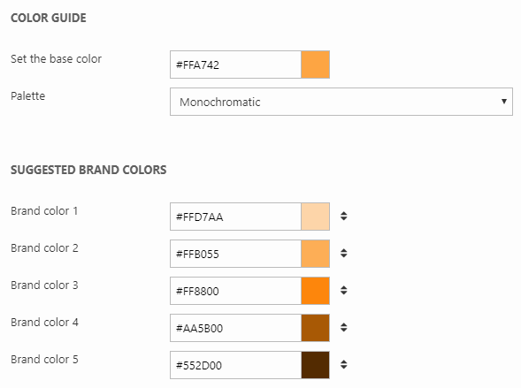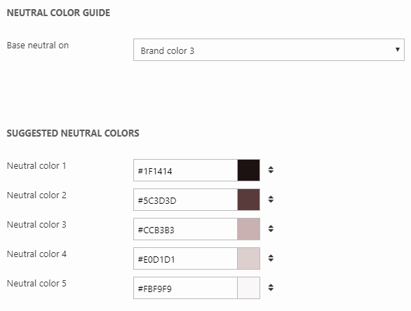 Brand colors are generated on the left side and neutral colors (based on a brand color) on the right side - it is also possible to override each generated color manually.