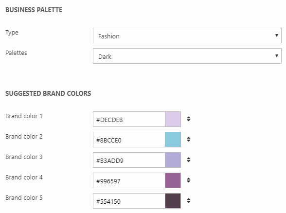 Selecting business palette (Figure 3.3), you can choose between predefined color themes in Dynamicweb where you can select a type and then a specific palette for this type.
