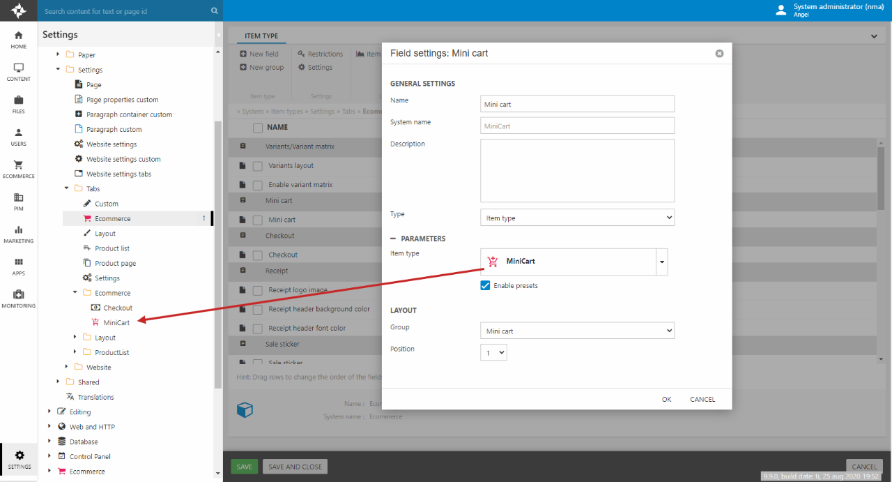 The Mini cart field in the settings is a field with the Item Type type and links over to another item type called MiniCart.