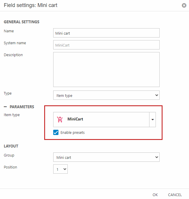 A prime example of using the Item Type is the in the website settings for a Rapido solution. The Item Type item type is used multiple times e.g. for the mini cart settings, where presets are also enabled (Figure 1.2).