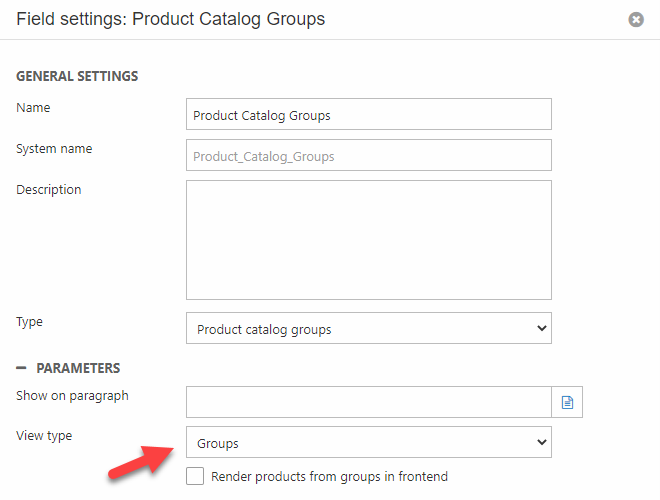 When you add this item field to an item, you should use the parameters set the View type to Groups (Figure 1.2) – this ensures that the editor can only select groups using the selector. This item field does not properly support selecting products.