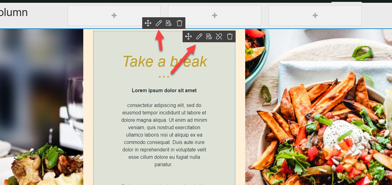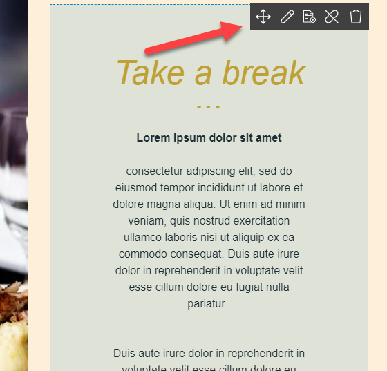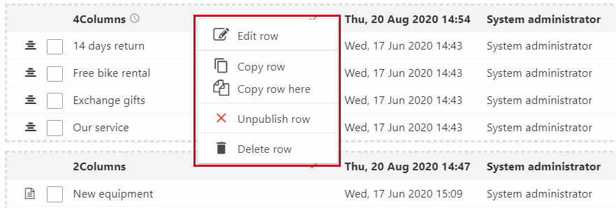 The paragraph list for content pages looks a bit different and you have some new options. First off, the content is divided into their individual rows and each row is bordered with dashed lines. For each row, you have a greyed-out line at the top with row information displaying:
