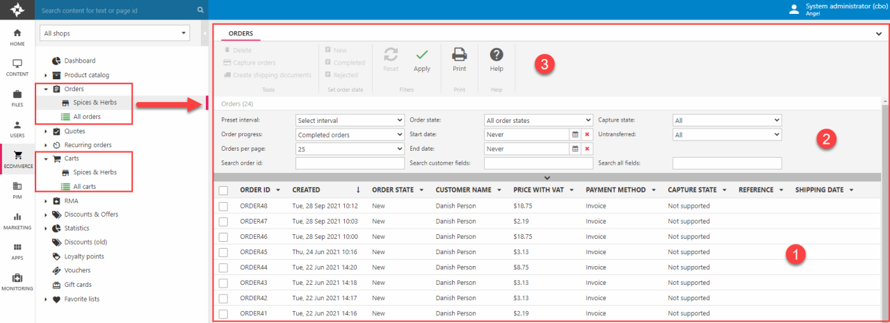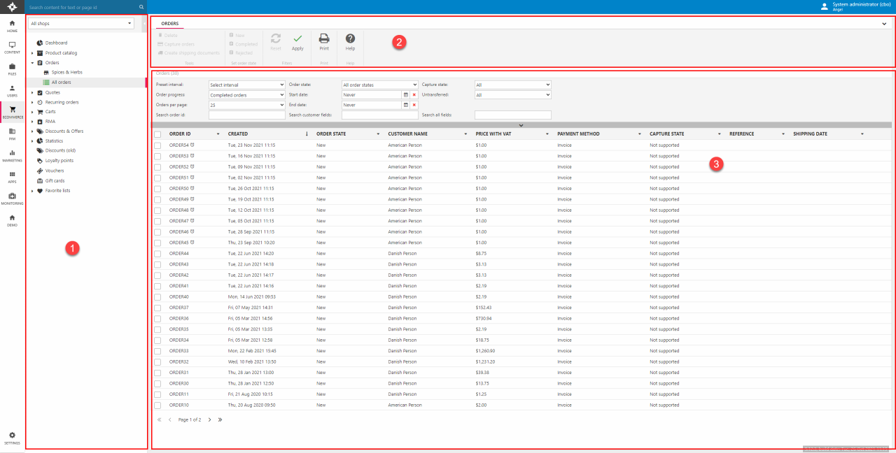 Like other areas of Dynamicweb, the Ecommerce area is accessed via the area menu - and consists of a tree (1) where you select the feature you want to work with, a toolbar (2) which gives you access to more advanced features and functions, and a content area (3) which is where you view and work with data.