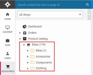 In Dynamicweb, products are organized in shops and product groups, both of which are located under the Product Catalog node in the Ecommerce tree (Figure 2.1).