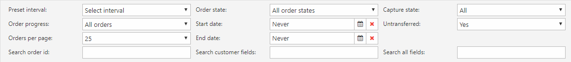 You can also search for a specific cart or order id, customer fields like Name, or even All fields – although this is slow on solutions with many orders. Filters are applied by clicking the Apply button in the ribbon bar - and reset by clicking the Reset button.
