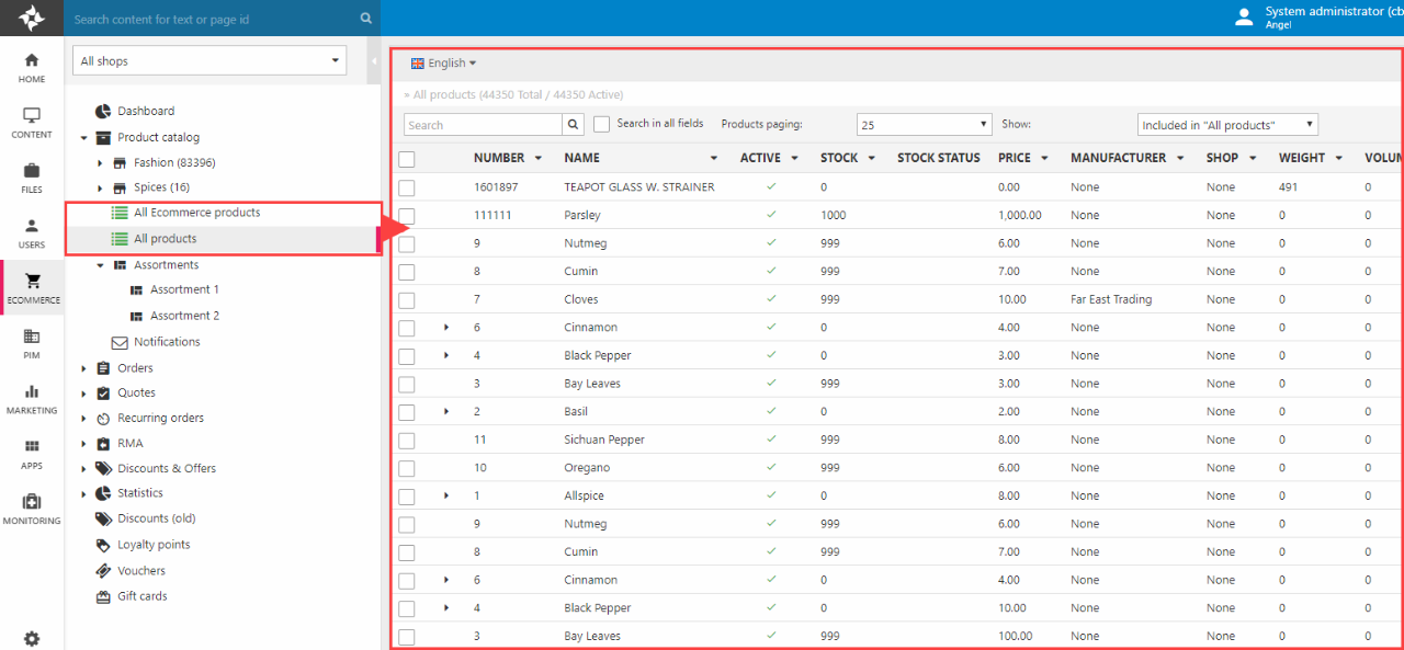Two special product lists – All products and All Ecommerce products – exist outside of the regular shop & product group structure (Figure 3.2).