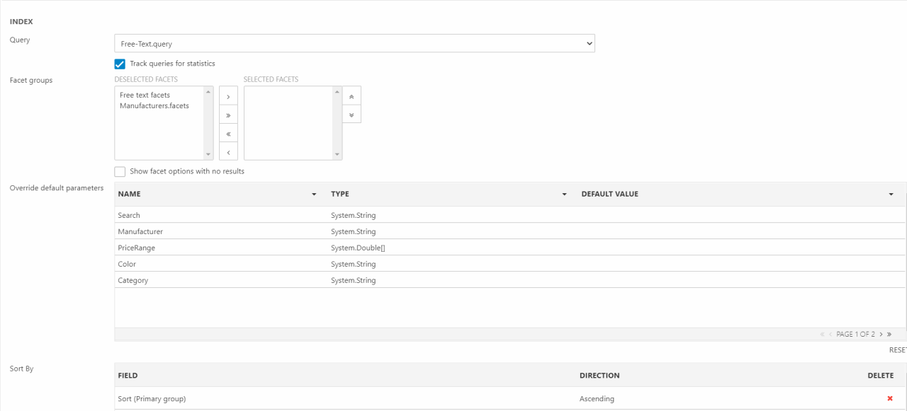 - (Optional) Select one or more facet groups associated with the query – facet groups are used to create filters in frontend so the customer can narrow down their search results