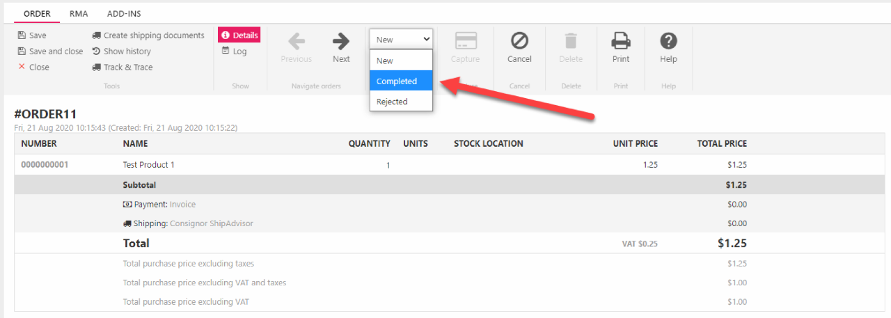 Too change cart or order states from the backend you open the cart or order and then select a new state in the ribbon bar dropdown (Figure 3.1) and then save.