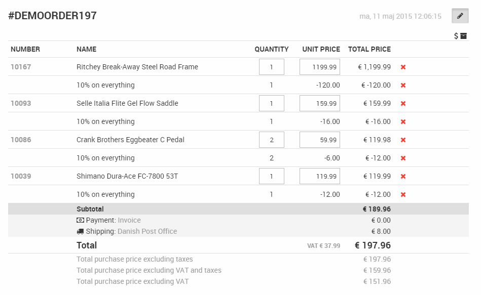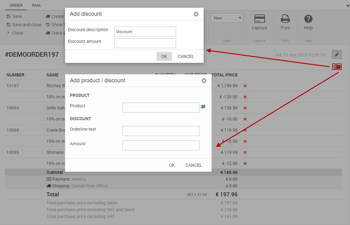 Using the Editing-tools you can also add products and add discounts to an order (Figure 9.3).