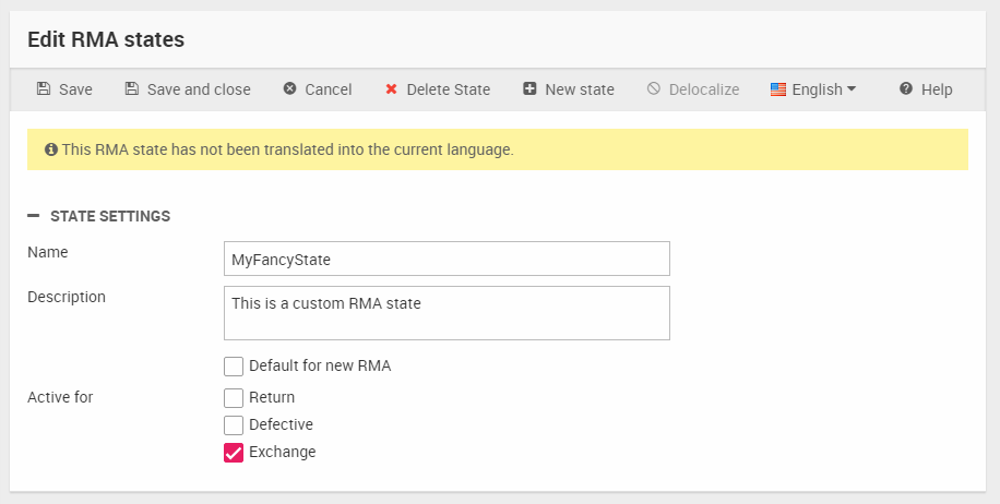 RMA states are custom states for controlling your RMA process. A Dynamicweb solution is born with a number of default states, such as ‘Waiting for product(s) from customer’, ‘Rejected’ and ‘Sent for repair’ – but you can easily create new RMA states