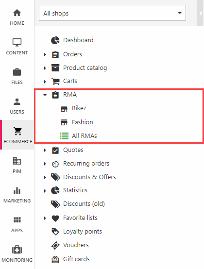 • Click a shop to open the RMA list for that shop only - or All RMAs to see all RMAa created on the solution