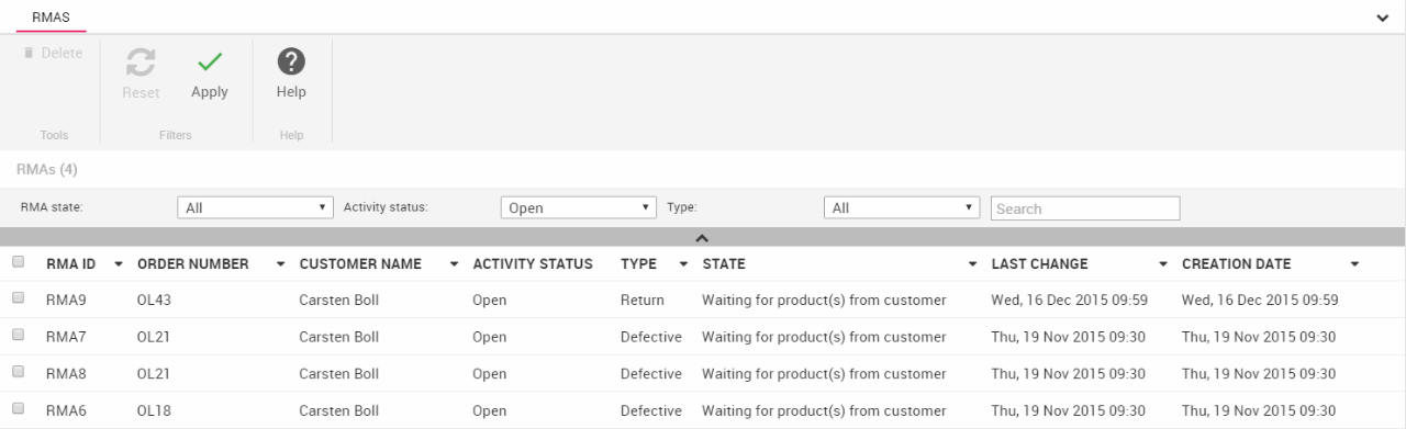 • The activity status (open/closed/deleted) and RMA state. An RMA state is a customizable step in an RMA flow, read more below.