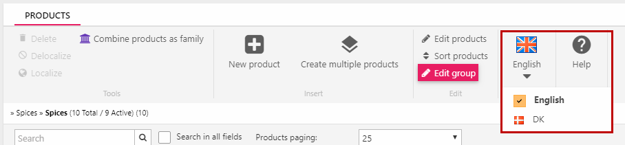 Once more than one Ecommerce language has been created, you can switch between language contexts in Dynamicweb Ecommerce by clicking the little flag icon in the ribbon bar of e.g. a product list (Figure 2.1)