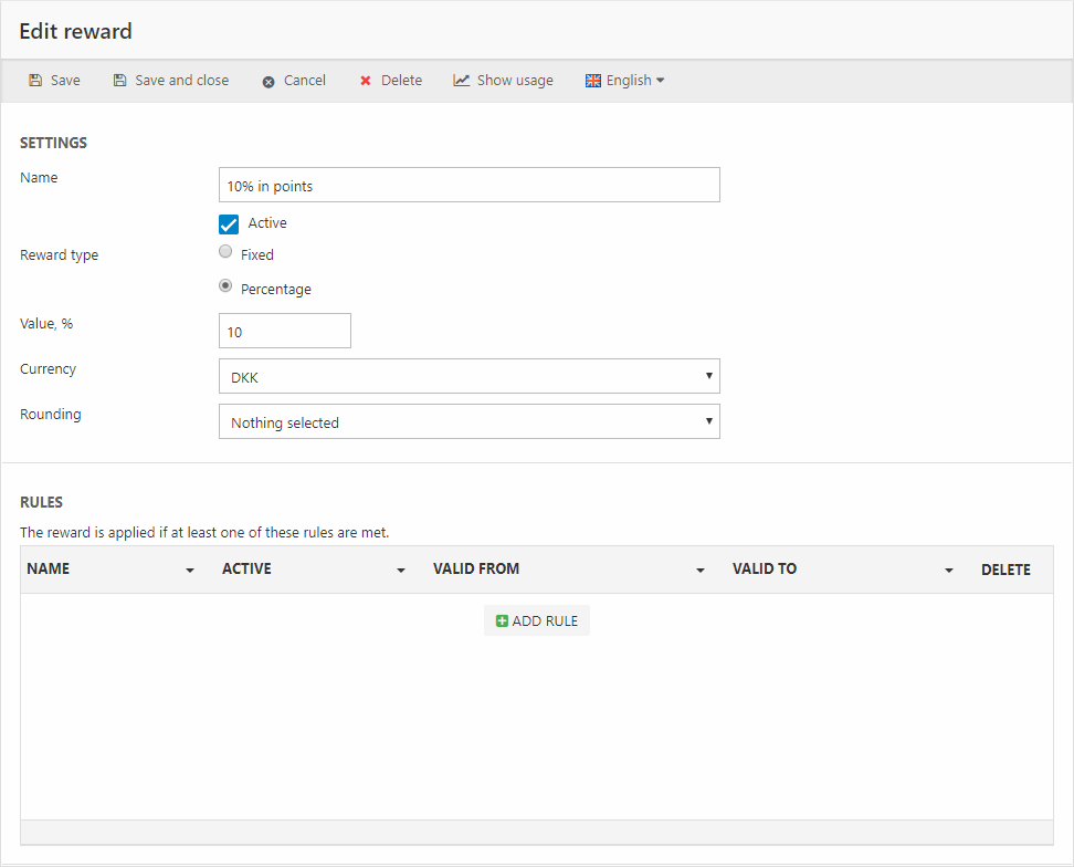 Reward rules are used to define a reward and a set of triggers for awarding the, erh, award. So a reward rule could be ’2%’ and the trigger(s) could be ’Buys for more than 1000 DKK’ or ’buys one of X products’.