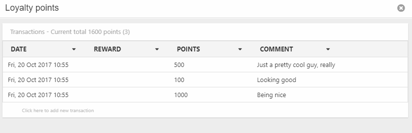 • Click Click here to add a new transaction to add points – and optionally a comment about the transaction – to the user