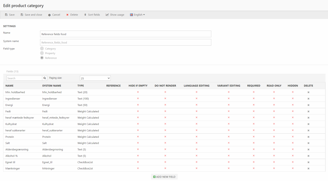 These different field collection types are described in more detail later in this article, but the general idea is that product categories and product properties are used to extend products with custom fields, whereas reference fields are used to 'gather' all the values from a field used on multiple categories - e.g. Color - in order to make it easier to create facets on product lists which contain products from several product groups.