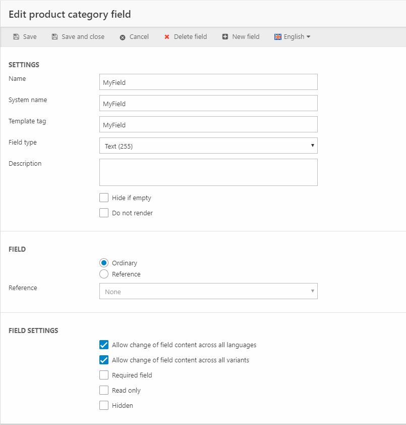Once the category has been saved, you must add at least one category field to it. To create a product category field click Add new field and fill in the field settings (Figure 1.2).