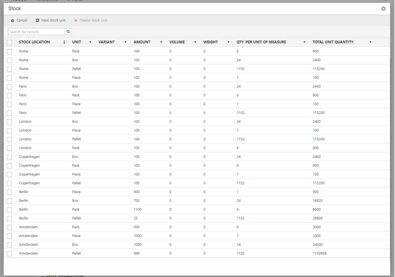 - A stock matrix for more complicated setups, e.g. where you need to track stock across several stock locations, variants, and/or product units