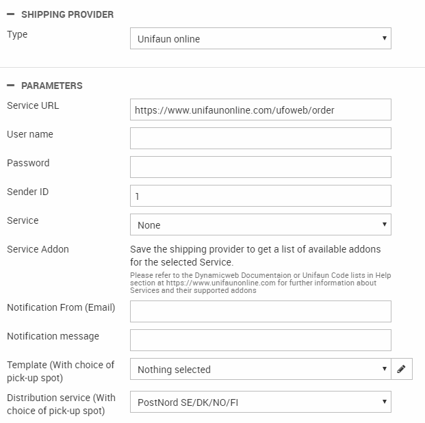 • Provide a Sender ID (quick ID). If you have more than one sender profile associated with your Unifaun Online-account, enter the one you want to use with this method. Read more about Senders and Receivers in the nShift Delivery documentation.