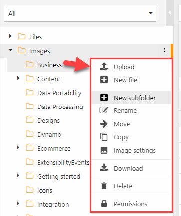 - New subfolder – create a new subfolder under the folder