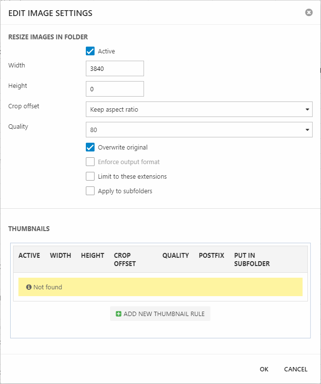 You can also auto-generate thumbnail images – but we recommend using the Image Handler tool to dynamically manipulate images when they are rendered instead.
