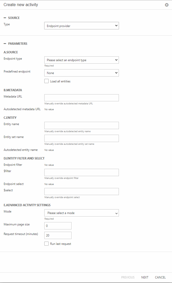 - To specify the exact entity you wish to import in the source settings. This way you can create a quick single-purpose data integration activity. An integration activity specific to a single entity also enables the use of preconfigured mappings for OData v4 endpoints.