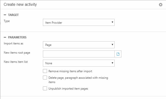 - If Remove missing items after import is checked, the activity deletes existing items which are not present in the import. The scope is limited to a particular page, if a page has been selected under New items root page.