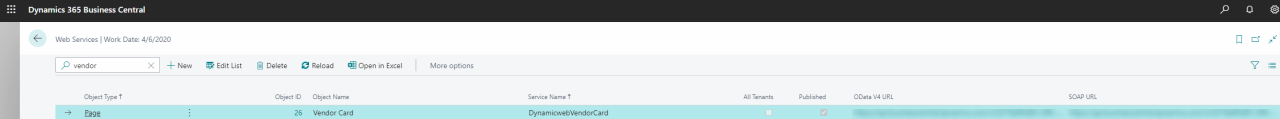 - Locate and copy the OData v4 URL in Business Central Web Services (see below)