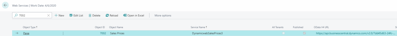 - Append "Lines" to the located URL - for example, if your Business Central web service is called MySalesPriceList the URL inserted should end with MySalesPriceListLines