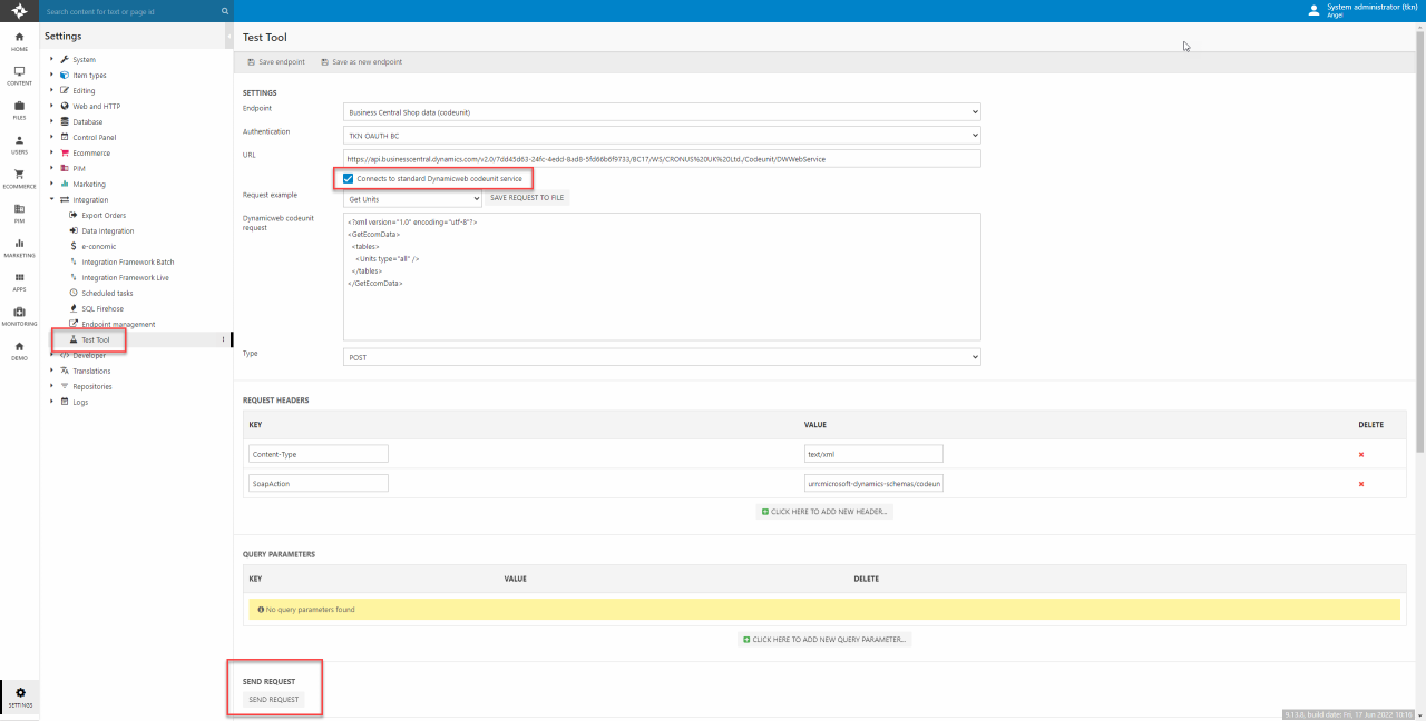 The internal Test Tool of Dynamicweb contains functionality for testing requests to and responses from an endpoint – in a manner reminiscent of Postman and similar tools.
