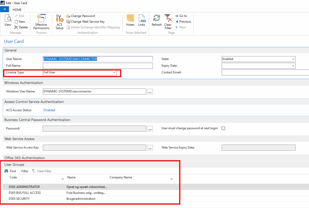 To connect to the web service from the Dynamicweb Connector service you need to configure a user in BC - Go to Users and add a user like shown in Figure 4.2. If you want to create orders in BC via the live integration the user must have D365 BUS FULL ACCESS permission - if not, D365 BASIC will suffice.
